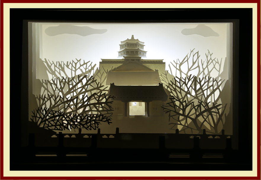 “江山扶绣户,日月近雕梁”,这是建筑学院金秋野老师要求学生能够表现出的建筑意境。在制作模型过程中,经常有同学因为不满意自己的作品,把做好的图纸撕了,重新来做。古建的任毅在模型制作中遇到了很多困难,几次撕毁自己的图纸。他说道:“我难以在局限的小箱子纵深空间里表达出实际的景深,再加上选景图片中有含有水面、倒影,这就更难了,所以几度撕图。不过也就是因此,才引发了我对纸雕的思考,用一层层平面表达深度,近处场景细化,中远景概括为轮廓,使得效果好了许多。同时在老师指导下,用夸张的方法将影子做出来,然后将实景具体化、精细化以表达出区别。” “要有做好的决心,多思考。”这是齐莹老师经常嘱咐学生的话。