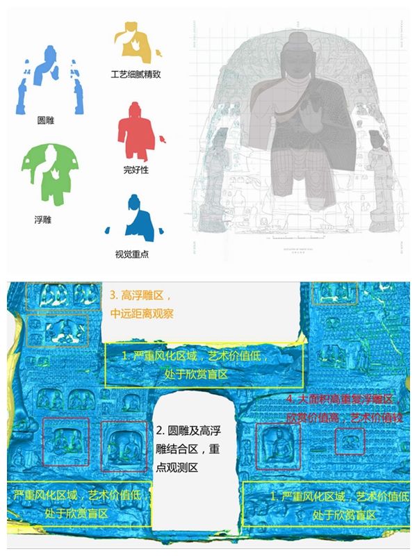 体量大、结构复杂一直以来是石窟文物保护与研究过程中的主要难题,结合石窟高保真复制对数据和图件的需求,团队经过研发推出了高精度三维信息留取与虚拟修复技术。建工建方吴志群老师介绍,团队利用基于精密点位测量数据的三维扫描控制定位工具,将佛像的空间位置信息以x、y、z坐标点的形式保存在数据库中,利用其在虚拟空间建立实体模型,并可标注rgb色彩的颜色值。这一关键技术的突破解决了大范围文物高精度亚毫米级信息留取的技术难题。在此基础上,团队根据测绘所得数据,建立了由文物正射影像图、骨架线图、特征线划图、三维模型等九大类图组成的文物空间信息多元数字化表达体系。