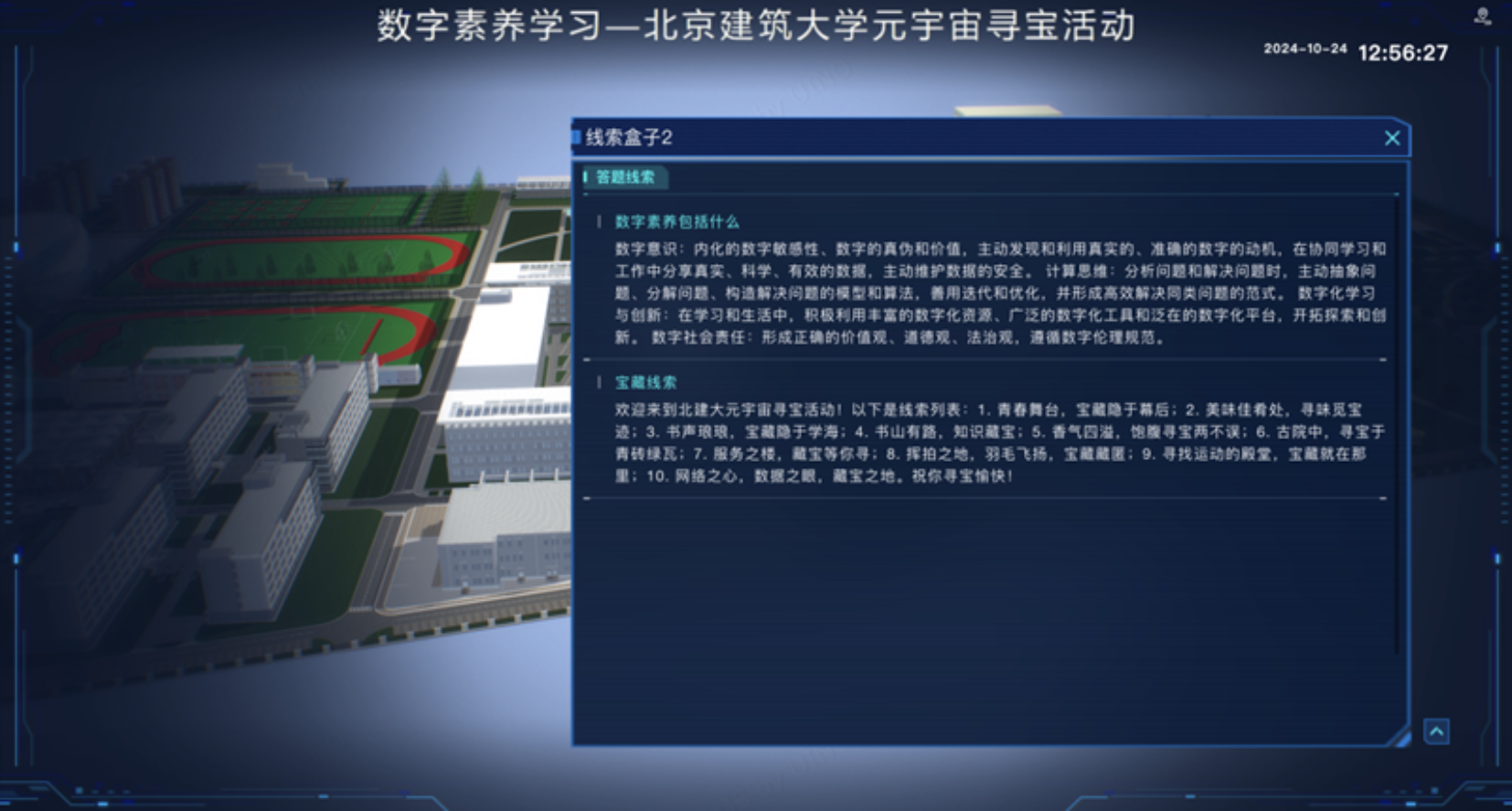 寻宝者通过控制鼠标键盘,漫步在北建大元宇宙这个三维空间中,开展一场别开生面的寻宝游戏,通过寻找10个隐藏的“宝盒”,点击“线索盒子”可以学习了解数字素养和网络安全知识,还能在线索列表中获取到其他宝盒位置的提示,点击“宝藏盒子”答题赢取奖品。