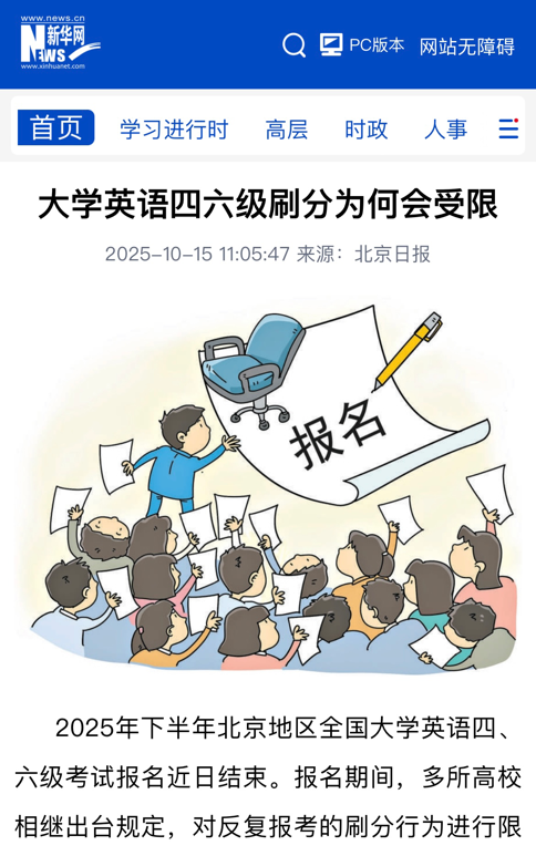2025年下半年北京地区全国大学英语四、六级考试报名近日结束。报名期间,多所高校相继出台规定,对反复报考的刷分行为进行限制。那么,高校为什么要限制四、六级刷分?四、六级考试与研究生英语统考哪个更重要?大学生应该怎样正确对待公共英语课的学习呢?