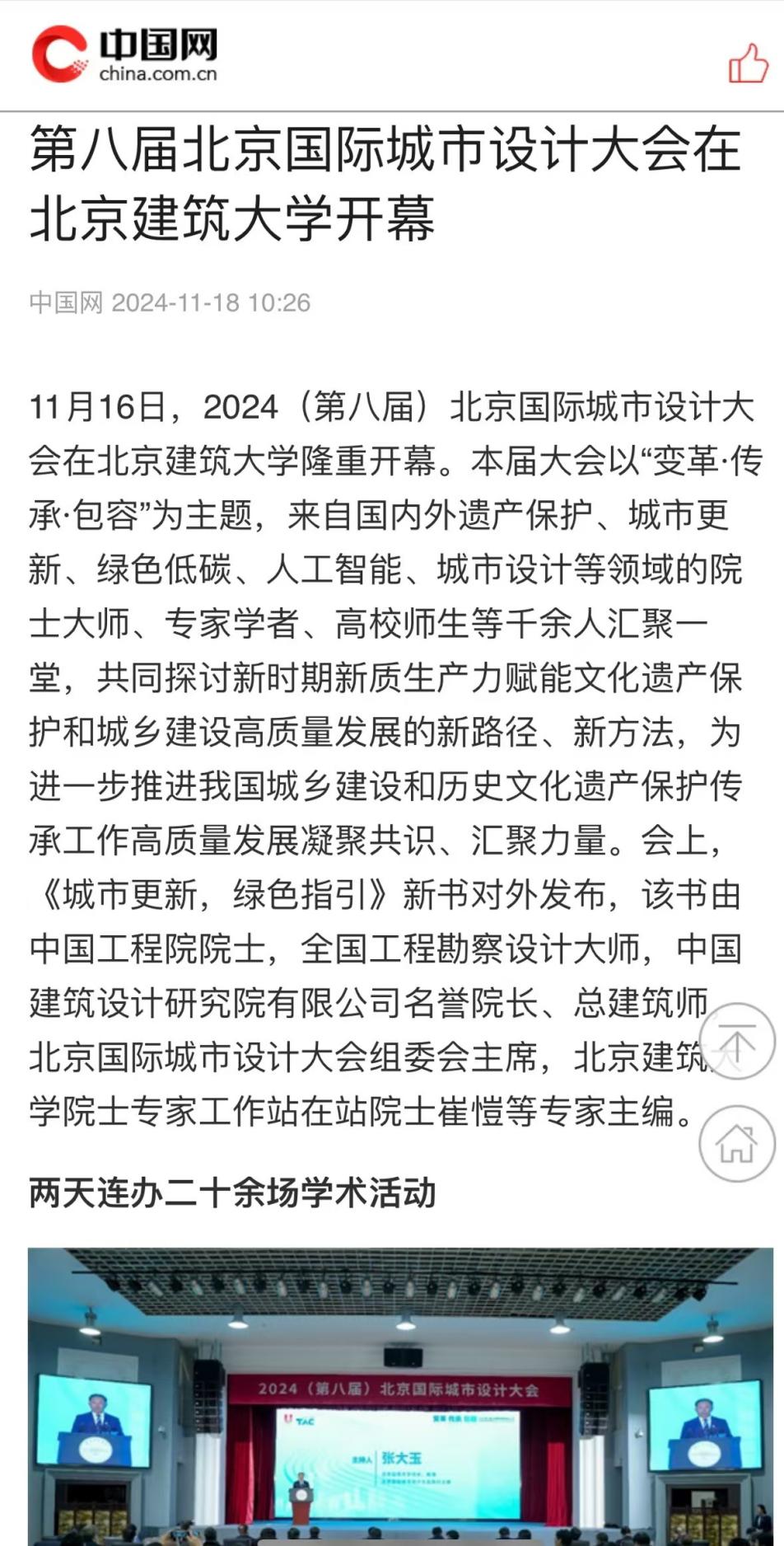 11月16日,2024(第八届)北京国际城市设计大会在北京建筑大学隆重开幕。本届大会以“变革·传承·包容”为主题,来自国内外遗产保护、城市更新、绿色低碳、人工智能、城市设计等领域的院士大师、专家学者、高校师生等千余人汇聚一堂,共同探讨新时期新质生产力赋能文化遗产保护和城乡建设高质量发展的新路径、新方法,为进一步推进我国城乡建设和历史文化遗产保护传承工作高质量发展凝聚共识、汇聚力量。会上,《城市更新,绿色指引》新书对外发布,该书由中国工程院院士,全国工程勘察设计大师,中国建筑设计研究院有限公司名誉院长、总建筑师,北京国际城市设计大会组委会主席,北京建筑大学院士专家工作站在站院士崔愷等专家主编。