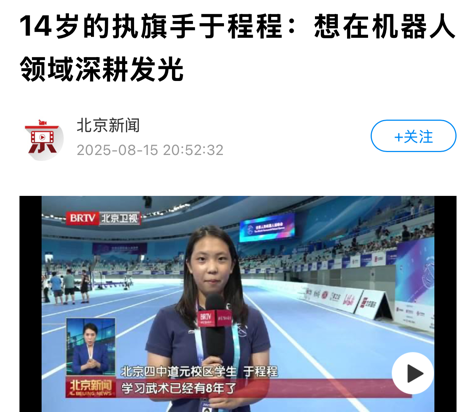 #运动会执旗手是年龄最小参赛#【14岁的执旗手于程程:想在机器人领域深耕发光】在2025世界人形机器人运动会上,年仅14岁的执旗手于程程是开幕式上一道亮丽的风景线,更以本届运动会年龄最小参赛工程师的身份,让世界看到了中国年轻一代与科技碰撞出的耀眼火花。为了更好地和机器人护旗手配合,她笑称自己的步子都变得像机器人了。当机器人真正做出这套动作的时候,于程程收获了满满的成就感,未来她想在机器人领域深耕发光。#2025世界人形机器人运动会看点满满##人形机器人跑1500米像极了人生#