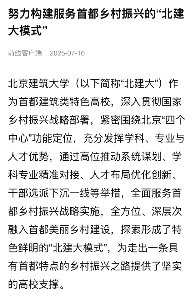 北京建筑大学以高度的政治自觉和强烈的使命担当,立足学科之本,汇聚人才之智,特别是通过精准选派和全力支持驻村第一书记这支“先锋队”,找准了服务首都乡村振兴的切入点和发力点。从擘画蓝图到产业落地,从文化铸魂到治理增效,北建大人用智慧和汗水在京华大地上描绘出一幅幅共建共治共享的和美乡村新画卷。面向未来,学校将继续发挥建筑类高校独特优势,深化“三强一服”实践,为探索具有首都特点的乡村振兴与共同富裕之路贡献更大力量。