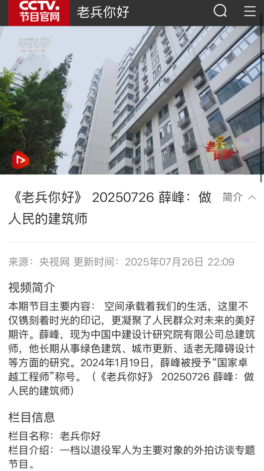 2025年7月26日,央视网《老兵你好》节目采访了北京建筑大学校友薛峰。
