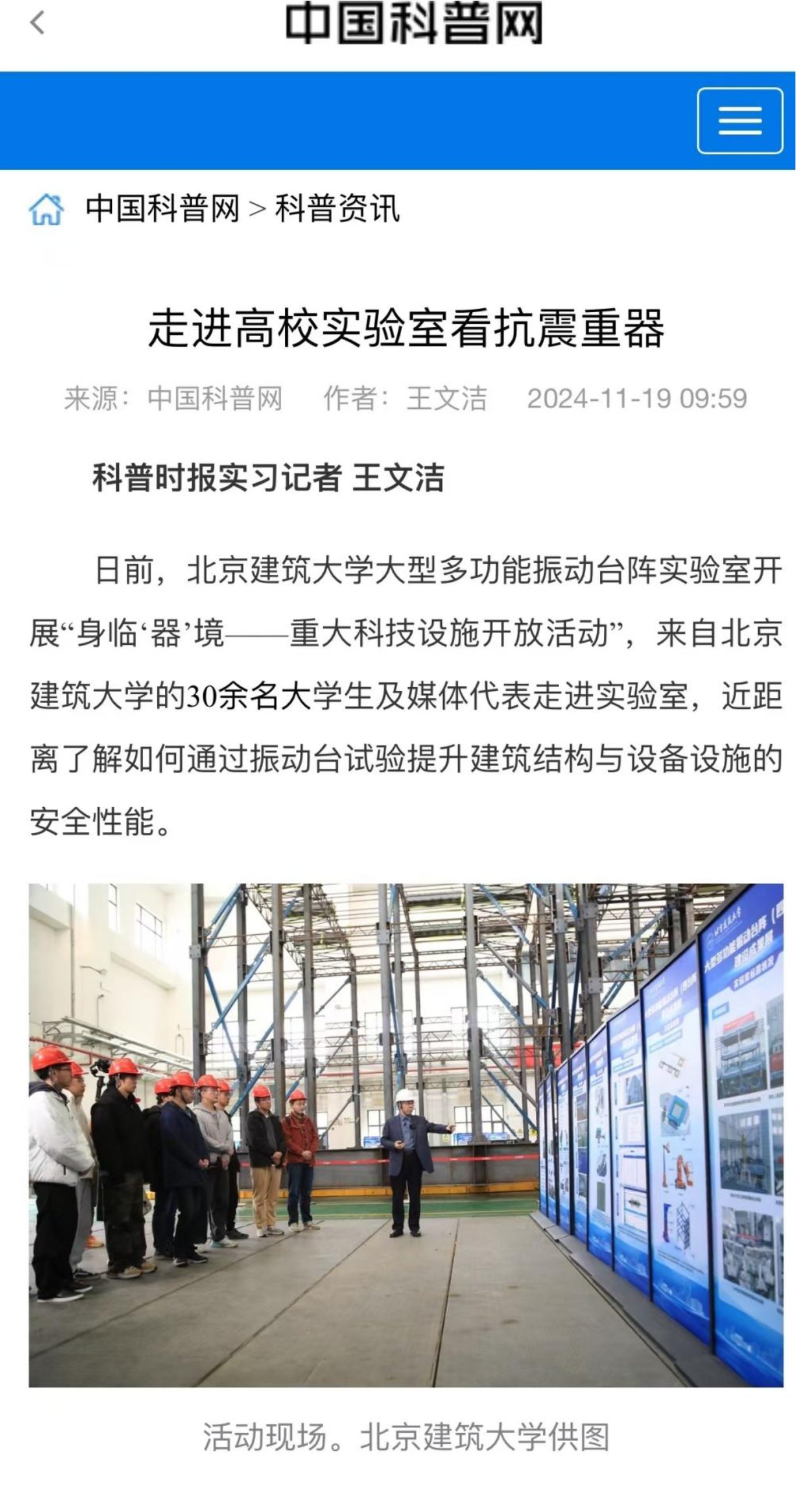 日前,北京建筑大学大型多功能振动台阵实验室开展“身临‘器’境——重大科技设施开放活动”,来自北京建筑大学的30余名大学生及媒体代表走进实验室,近距离了解如何通过振动台试验提升建筑结构与设备设施的安全性能。