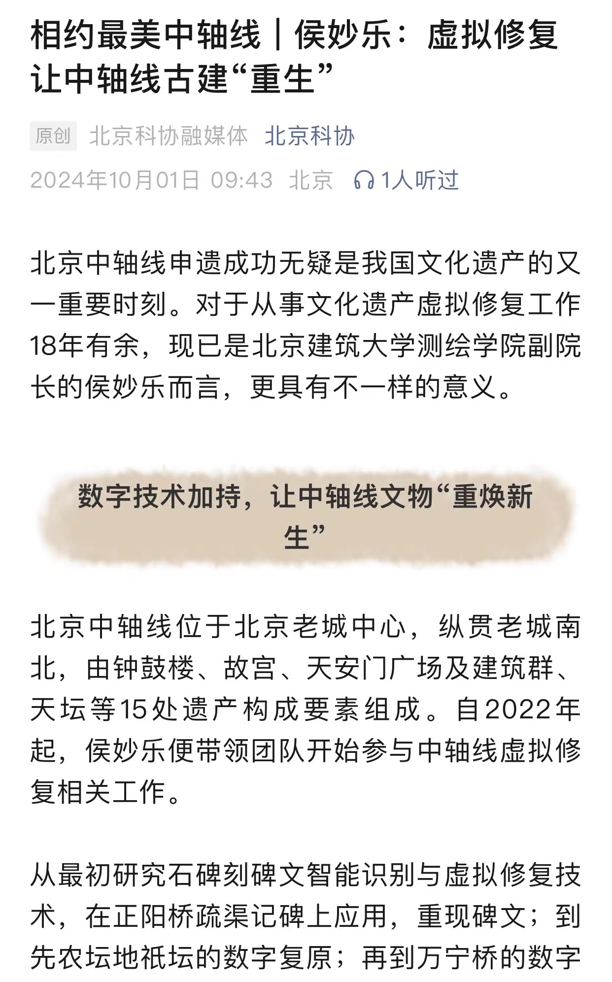 北京中轴线申遗成功无疑是我国文化遗产的又一重要时刻。对于从事文化遗产虚拟修复工作18年有余,现已是北京建筑大学测绘学院副院长的侯妙乐而言,更具有不一样的意义。