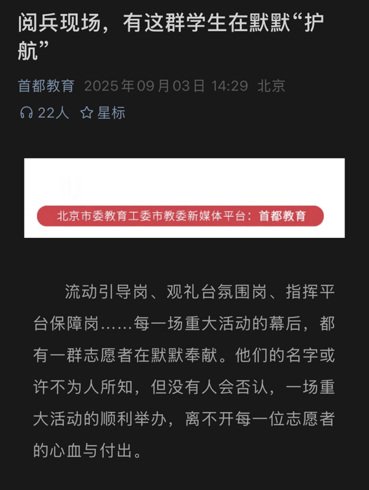 高校志愿者优中选优确保活动万无一失从2019年庆祝中华人民共和国成立70周年活动,到2021年庆祝中国共产党成立100周年活动,再到北京2022年冬奥会和冬残奥会,首都高校在一次次重大活动中积累了丰富的志愿服务经验,形成了首都高校志愿服务模式。今年,在中国人民抗日战争暨世界反法西斯战争胜利80周年纪念活动中,首都30多所高校把积累的经验、总结的模式应用其中,充分保障纪念活动的圆满成功。