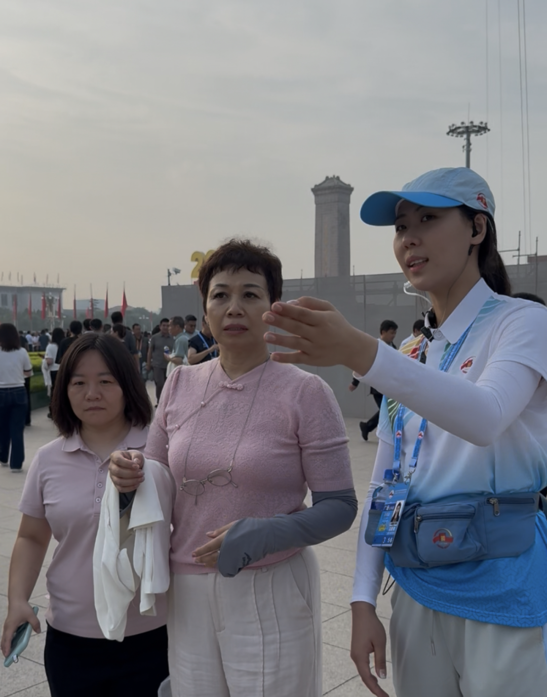 北京工商大学研二学生廖承禹是学校团委的学生副书记,曾参加过多项首都重大活动。目前,他已经累计志愿服务时长1094小时,是一名“志愿达人”。在这次活动中,他在广场东侧路线担任流动引导岗。“我和其他志愿者化身最美的风景线,排布在观礼人员必经的路线途中,用温暖的微笑引导、护送观礼人员有序经过。”廖承禹说,“人们的笑容,是对我最好的表扬。”