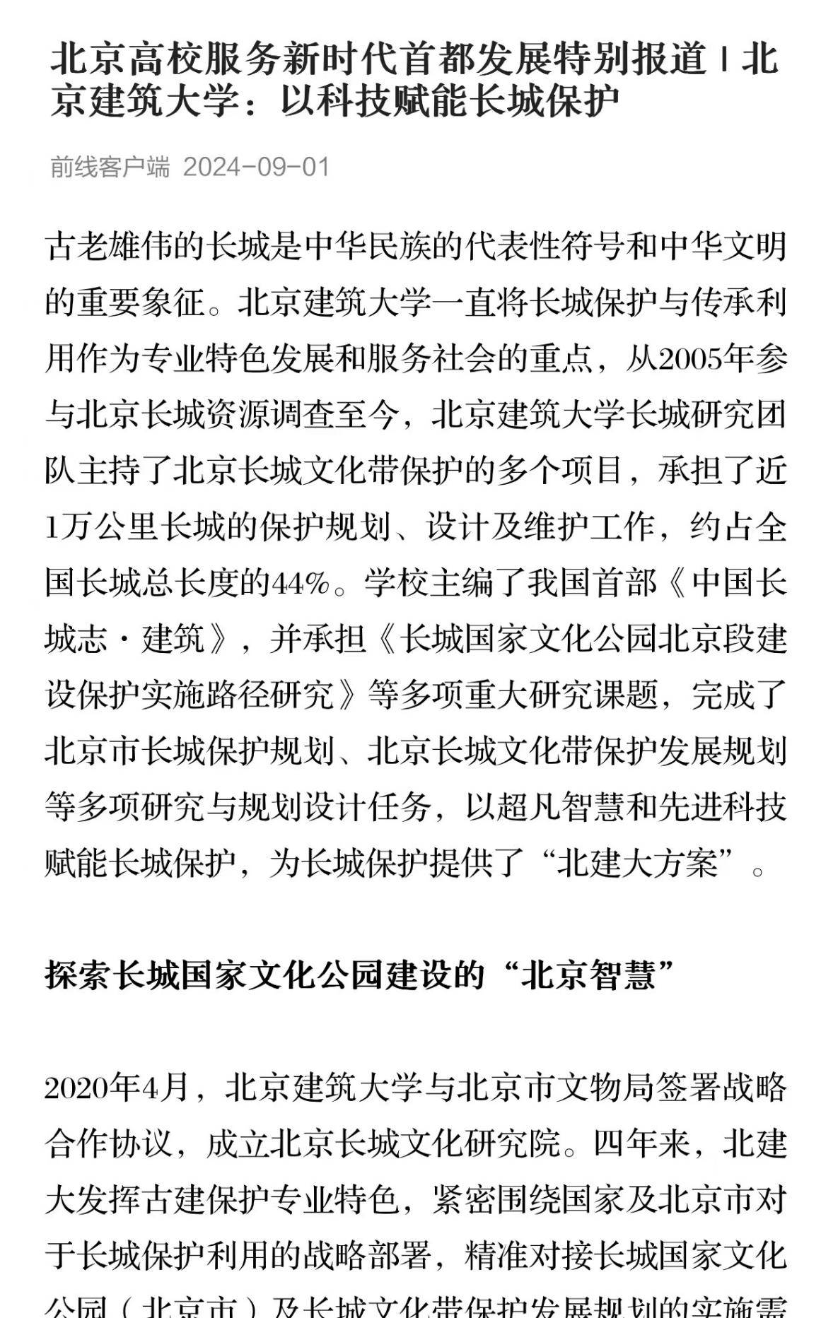 2020年4月,北京建筑大学与北京市文物局签署战略合作协议,成立北京长城文化研究院。四年来,北建大发挥古建保护专业特色,紧密围绕国家及北京市对于长城保护利用的战略部署,精准对接长城国家文化公园(北京市)及长城文化带保护发展规划的实施需求,深度挖掘并阐释了北京长城文化带的丰富内涵。通过精准识别并系统组织研究课题,北建大为政府决策提供了坚实的智力支持。此外,北建大联合北京长城所在区及北京市文物局下属研究机构共同开展长城文化带的各项研究和建设工作,开展长城保护宣传、长城保护员队伍教育和培训等多方面工作。
