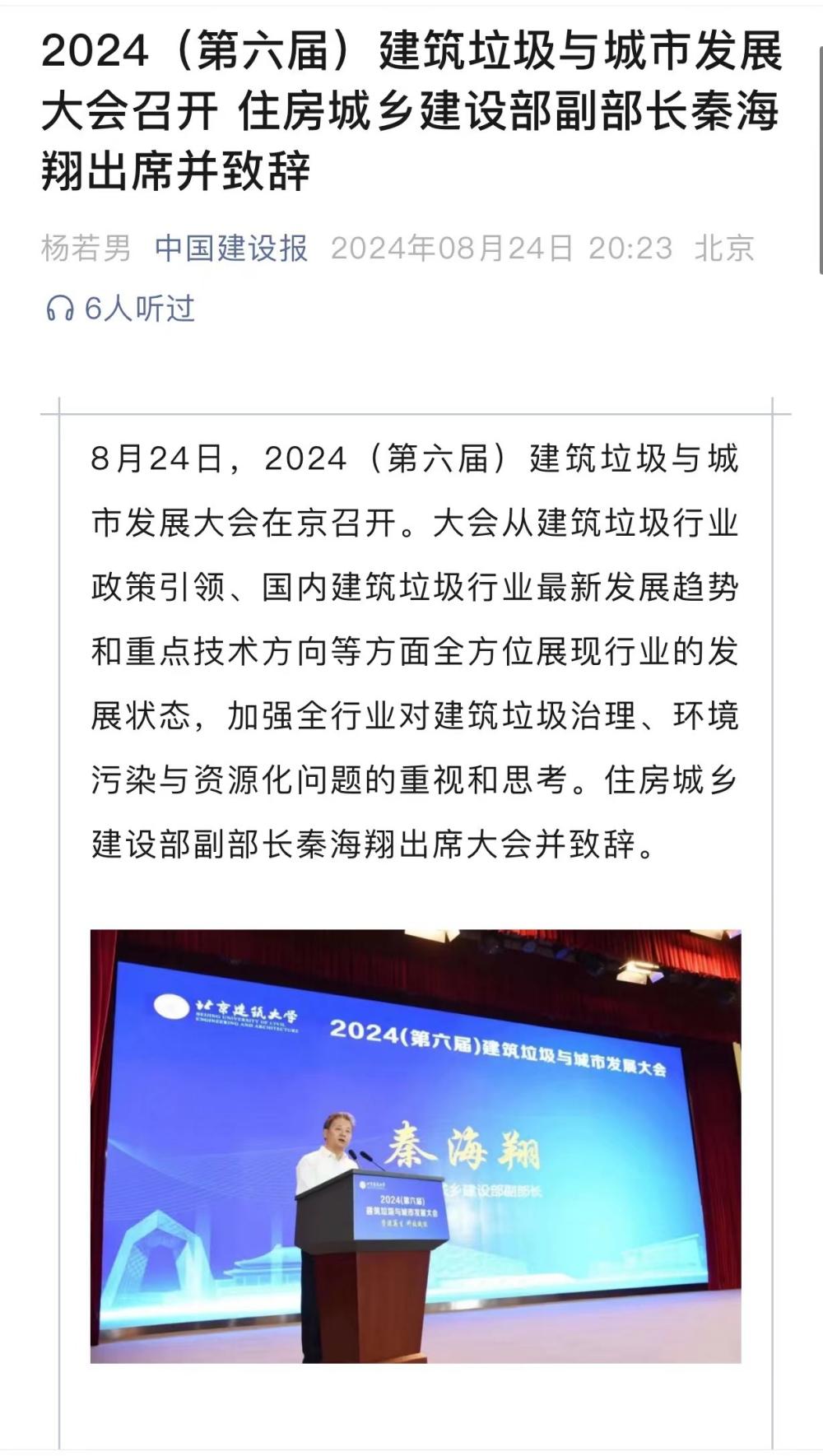 8月24日,2024(第六届)建筑垃圾与城市发展大会在京召开。大会从建筑垃圾行业政策引领、国内建筑垃圾行业最新发展趋势和重点技术方向等方面全方位展现行业的发展状态,加强全行业对建筑垃圾治理、环境污染与资源化问题的重视和思考。住房城乡建设部副部长秦海翔出席大会并致辞。