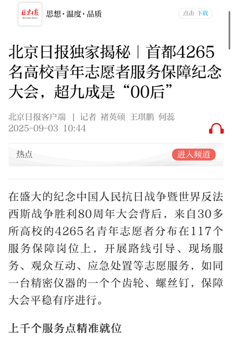 在盛大的纪念中国人民抗日战争暨世界反法西斯战争胜利80周年大会背后,来自30多所高校的4265名青年志愿者分布在117个服务保障岗位上,开展路线引导、现场服务、观众互动、应急处置等志愿服务,如同一台精密仪器的一个个齿轮、螺丝钉,保障大会平稳有序进行。