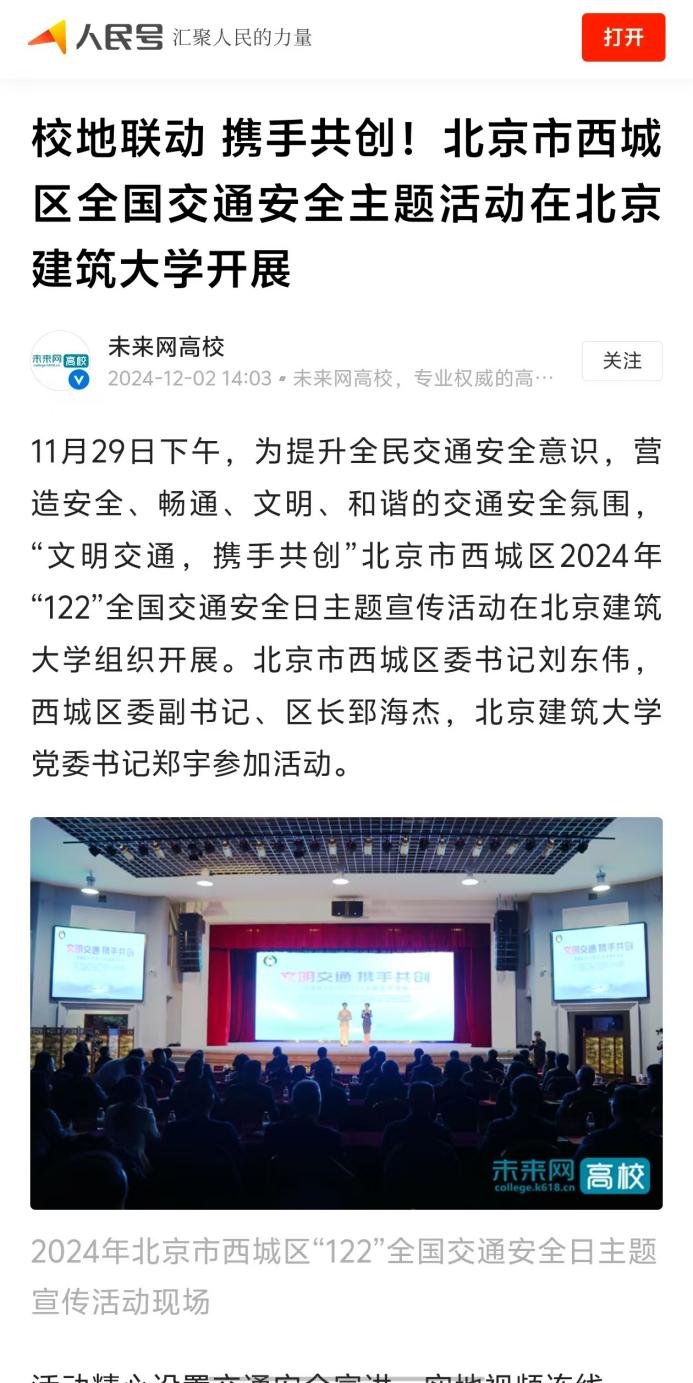 11月29日下午,为提升全民交通安全意识,营造安全、畅通、文明、和谐的交通安全氛围,“文明交通,携手共创”北京市西城区2024年“122”全国交通安全日主题宣传活动在北京建筑大学组织开展。北京市西城区委书记刘东伟,西城区委副书记、区长郅海杰,北京建筑大学党委书记郑宇参加活动。
