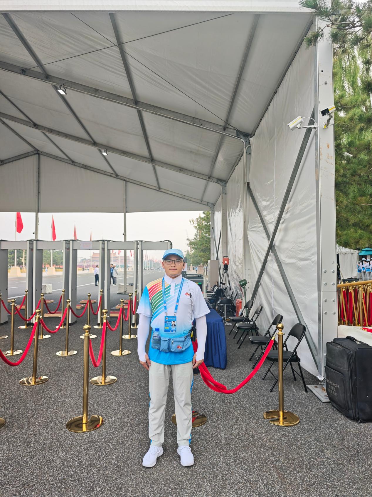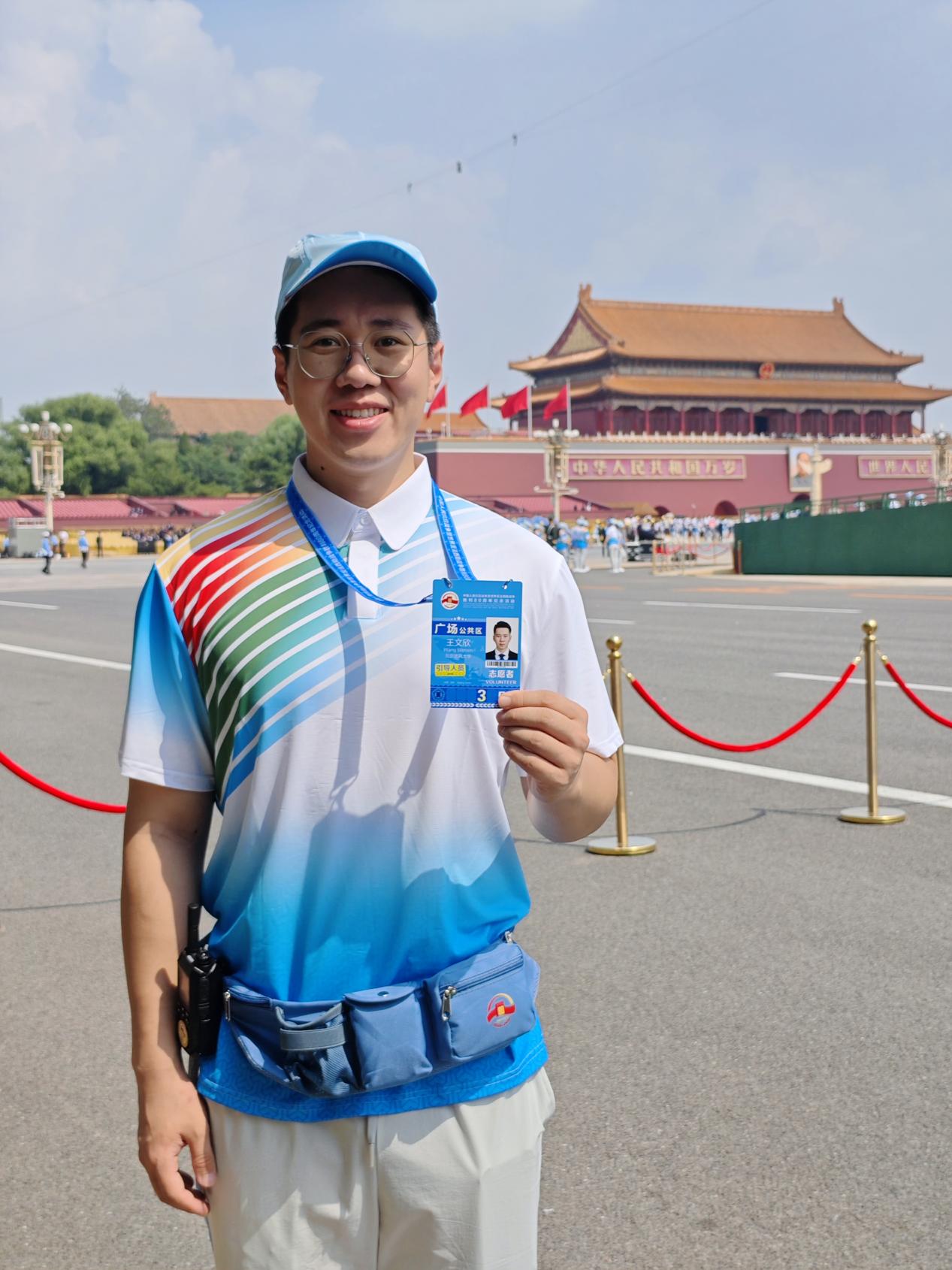我带领学校28名青年学生在首都博物馆进行志愿服务,主要为观礼人员提供路线引导,帮助管理人员开展物品存放、安检等工作。同时,我还负责我校全体志愿者的物资保障工作,从正式服装保管到试穿调换,从协调师生住宿到准备安全合适的物资存放场地,从餐食保障到配备防暑驱蚊套装,每一项平凡工作的背后都蕴藏着自己细致负责的工作态度和以人为本的工作理念,看到同学们没有后顾之忧的完成各项服务任务,看着我校学子再次在国家重大活动中闪耀北建大志愿服务的金名片,我由衷感到高兴和自豪。