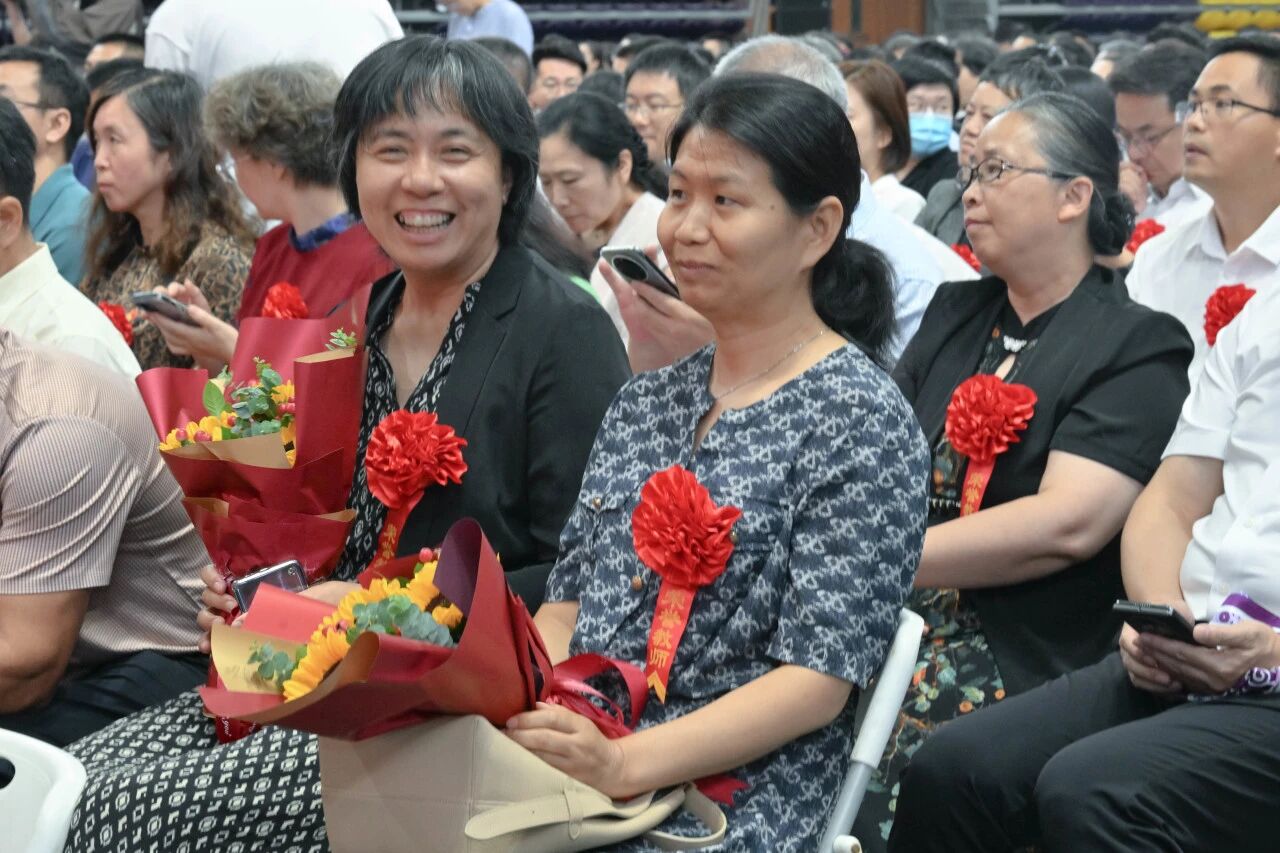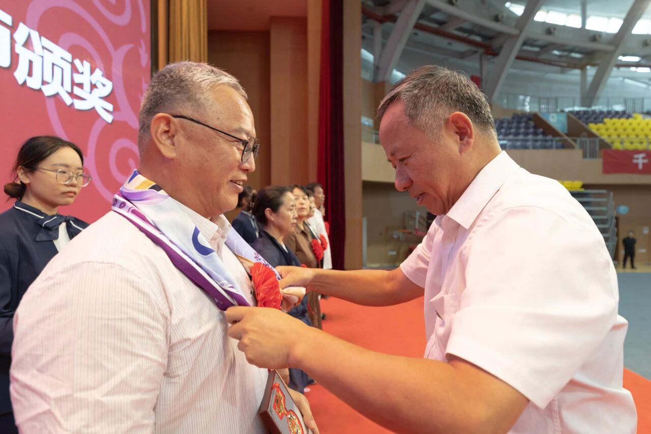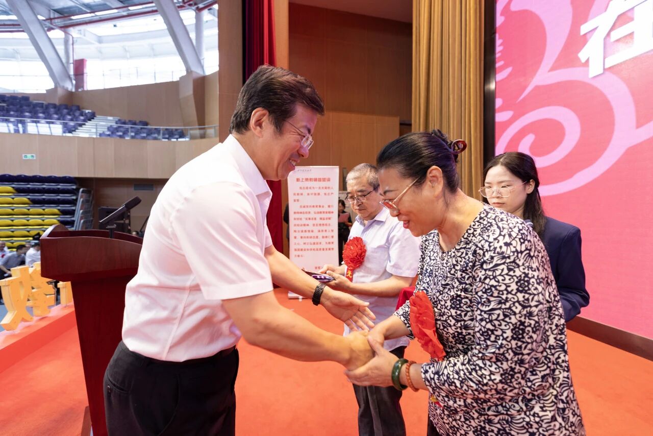 郑宇、张大玉为学校及建大附小、附中荣誉退休教师、在教育战线工作满三十年教师颁发荣誉纪念章,佩戴定制锦缎,学生代表为他们献上了祝福花束。
