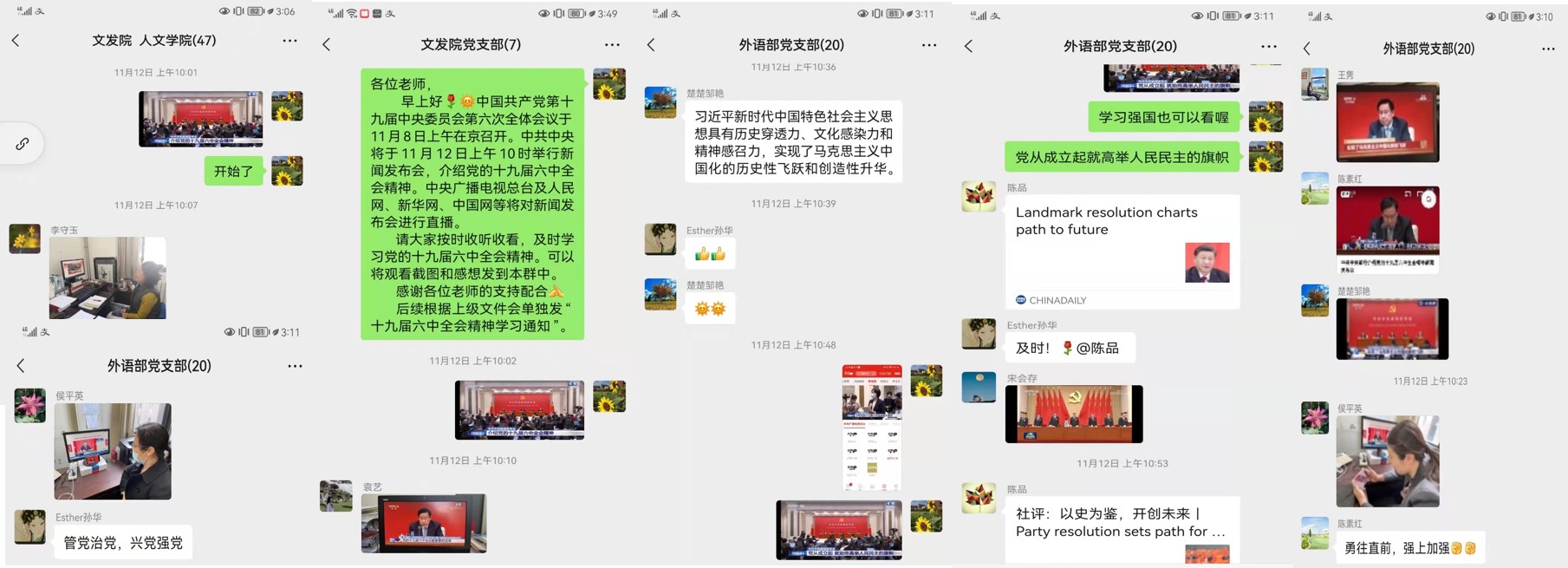 组织全体教职工线上观看十九届六中全会精神新闻发布会,文发院党支部结合校园文化建设进行研讨,外语部党支部结合china daily的英语新闻进行研讨学习。