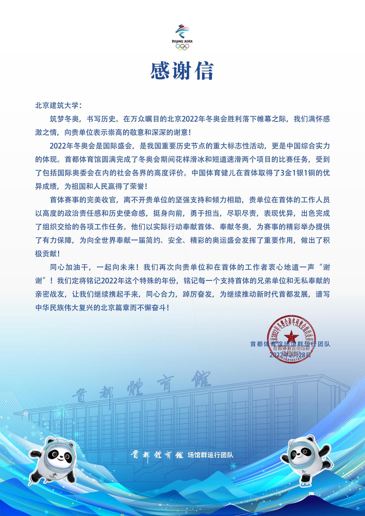 近日,学校分别收到来自团市委、北京冬奥组委开闭幕式工作部、首体馆场馆运行团队发来的感谢信。信中对我校在冬奥志愿者招募选拔培训、首体馆上岗服务、冬残奥会闭幕式与演出筹备工作提出高度赞扬,并对我校为北京冬奥会、冬残奥会胜利举办做出的重要贡献表示衷心感谢。