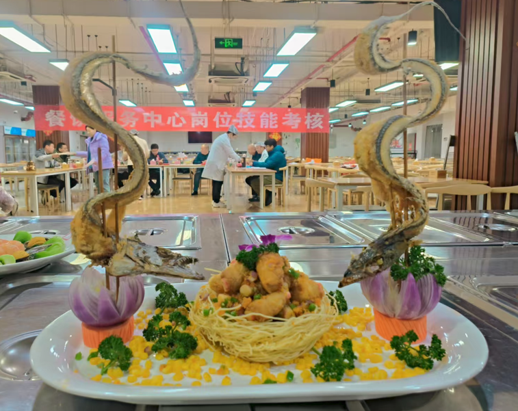 在副食组、冷荤组比赛现场,双龙戏珠、莲莲有鱼、金玉满堂、锦绣鳜鱼卷、凤尾西芹……,多道原创菜惊艳亮相,饱含“大师傅”们的精巧构思。“大师傅”们将自己对于职业的热忱、对建大的热爱、对师生们的责任融入到每一道菜品中。
