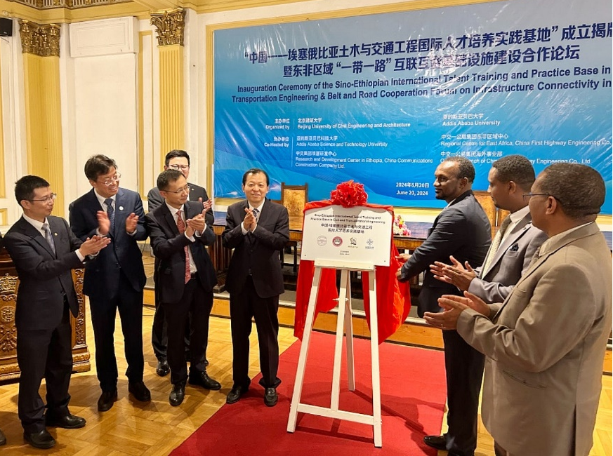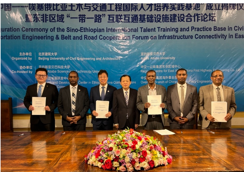 在基地成立仪式上,郑宇代表学校致辞,并与亚的斯亚贝巴大学代理校长马蒂沃斯·恩瑟姆、亚的斯亚贝巴科技大学校长德雷杰·恩吉达、中交一公局集团东非区域中心总经理韦强余共同签署基地合作意向书。埃塞俄比亚财政部部长艾哈迈德·希德,中共北京市委副书记、北京市人民对外友好协会会长刘伟,埃塞俄比亚教育部副部长寇莱·图舒尼,中国驻埃塞俄比亚大使馆临时代办申钦民出席会议并讲话。刘伟与寇·图舒尼共同为基地揭牌,并见证四方代表签署基地建设合作意向书。