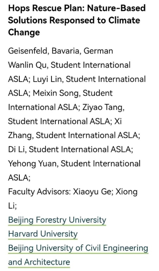 近日,美国风景园林师协会american society of landscape architects(asla)官方公布了2024年度学生奖获奖名单揭晓!北京建筑大学首次获得asla学生奖!由北京建筑大学2022级本科生袁业泓和北京林业大学、哈佛大学组成的学生团队项目啤酒花拯救计划:应对气候变化的自然ag百家乐的解决方案(hops rescue plan: nature-based solutions responsed to climate change)获得分析规划类(analysis and planning category)荣誉奖(honor awards)。asla从全球范围内征集优秀作品,用以表彰世界各地学生的顶级设计作品,颁奖典礼将于2024年10月7日在美国华盛顿举行。