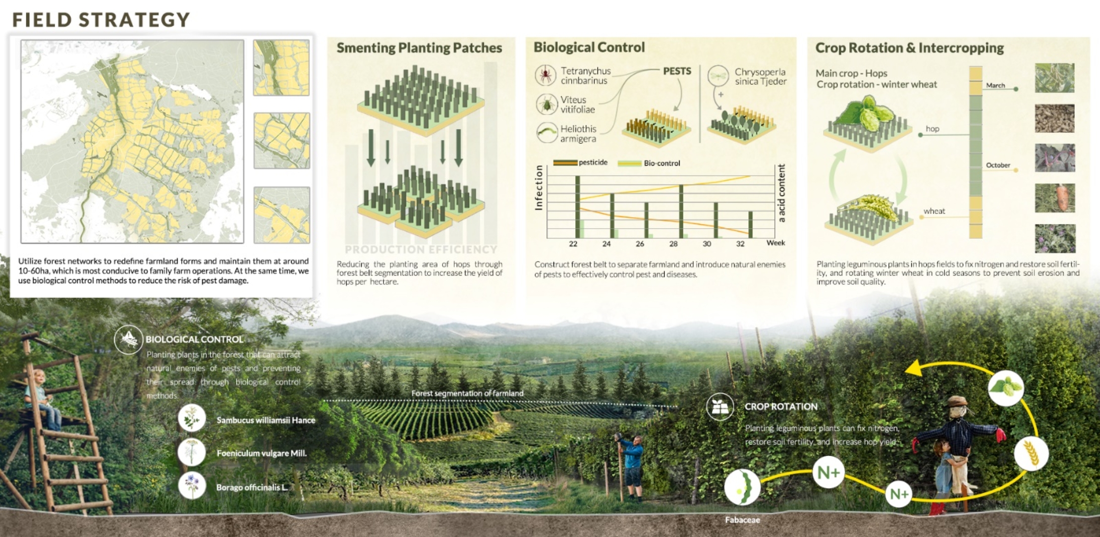 哈勒道地区的啤酒花种植模式主要为家庭农场,目前超大面积的啤酒花田令无数农户叫苦不堪。因此,根据文献研究与实践报告,我们利用森林网络重新划分农田形态,使其保持在最利于家庭农场运营的10-60ha左右。同时,我们利用生物防治手段,引入害虫红蜘蛛的天敌草蛉虫,在农田边界栽植食源植物还阳参与琉璃苣,这将有效阻隔虫的传播途径,从而降低虫害风险。