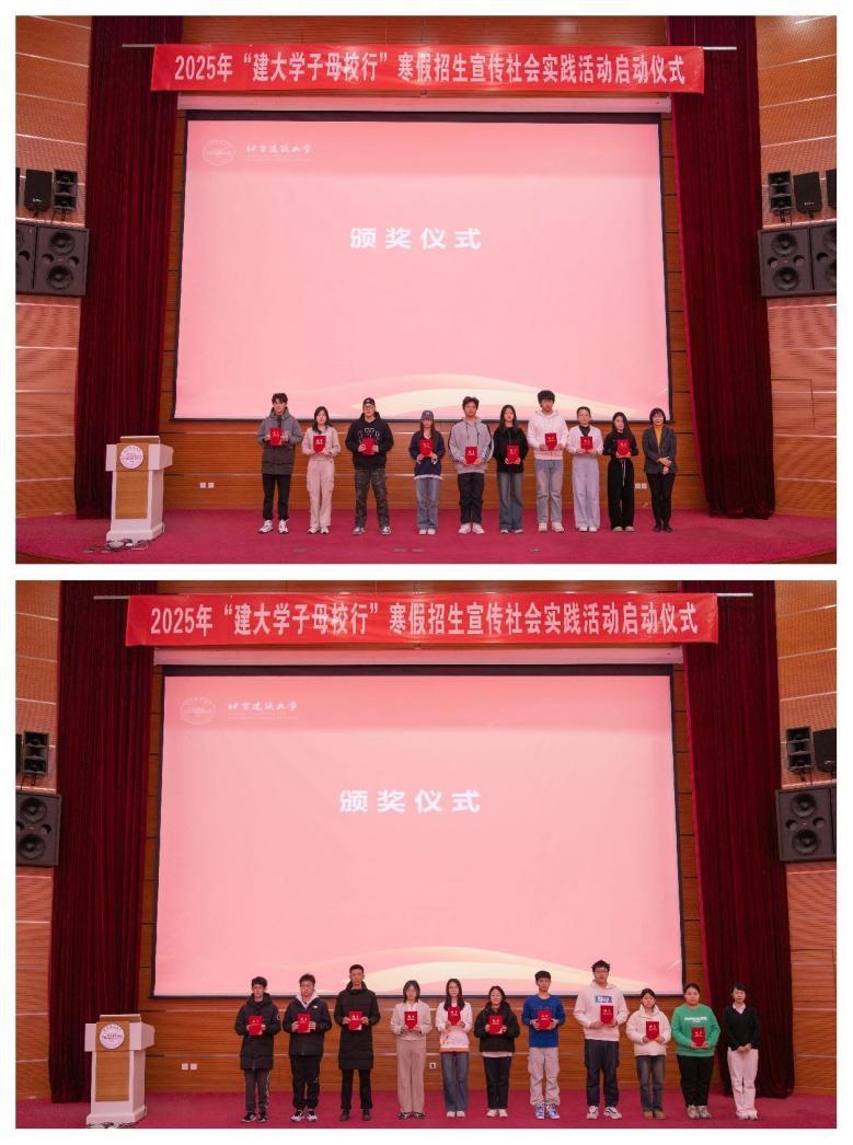 1月6日,由教务处、校团委共同举办的2025年“建大学子母校行”寒假招生宣传社会实践活动启动仪式在大兴校区基a报告厅成功举办。党委常委、副校长陈红兵,校团委书记康健、教务处副处长赵林琳、教务处副处长兼招生办公室主任胡德俊、校团委副书记刘倩出席活动,招生办公室工作人员、招生协会成员、2025年宣讲团成员、2024年宣讲团获奖代表等150余人参加活动。启动仪式由胡德俊主持。