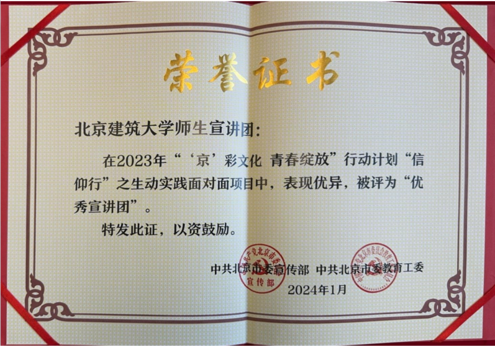 “高校师生走基层宣讲”活动是“‘京’彩文化,青春绽放”行动计划的重要内容。作为首批入选行动计划的高校,我校认真开展走基层宣讲活动。按照市委宣传部、市教工委的统一部署,2023年我校宣讲团主要深入大兴、石景山区的街道、社区基层一线开展宣讲;2024年,我校宣讲团将重点赴西城、大兴和经开区开展宣讲活动。目前,宣讲团已正式组建,由思政课教师代表和各学院优秀学生代表共30人组成。与会领导为宣讲团师生代表颁发聘书。