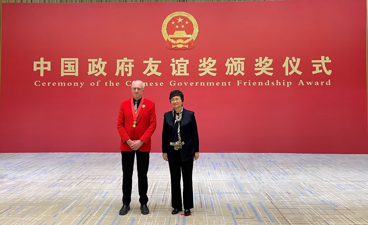 人力资源社会保障部部长王晓萍向马克教授颁发中国政府友谊奖奖章