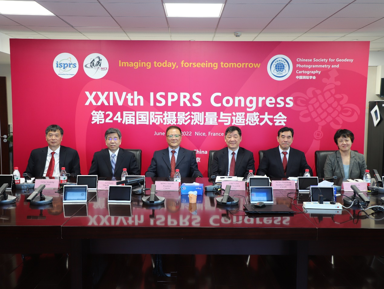 中国测绘学会代表团参加isprs全体会员代表大会(左起:自然资源部卫星中心总工唐新明、北京建筑大学副校长李爱群、中国测绘学会理事长宋超智、中国工程院院士陈军、中国测绘学会秘书长彭震中、北京建筑大学教授蒋捷)。
