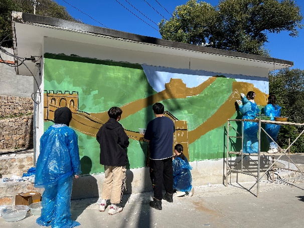 为进一步弘扬长城文化,师生团队结合延庆长城元素,以墙为载体,以彩绘为形式,利用一天时间共同创作“龙踞九州”墙画。从线稿、调色、勾线和上色,每一步都凝结着同学们的心血与汗水,墙画的绘制也得到了村委会和村民的大力支持,最终雄伟壮丽的长城跃然墙面,同学们用画笔勾勒美丽乡村画卷,以青春助力村容村貌提升。