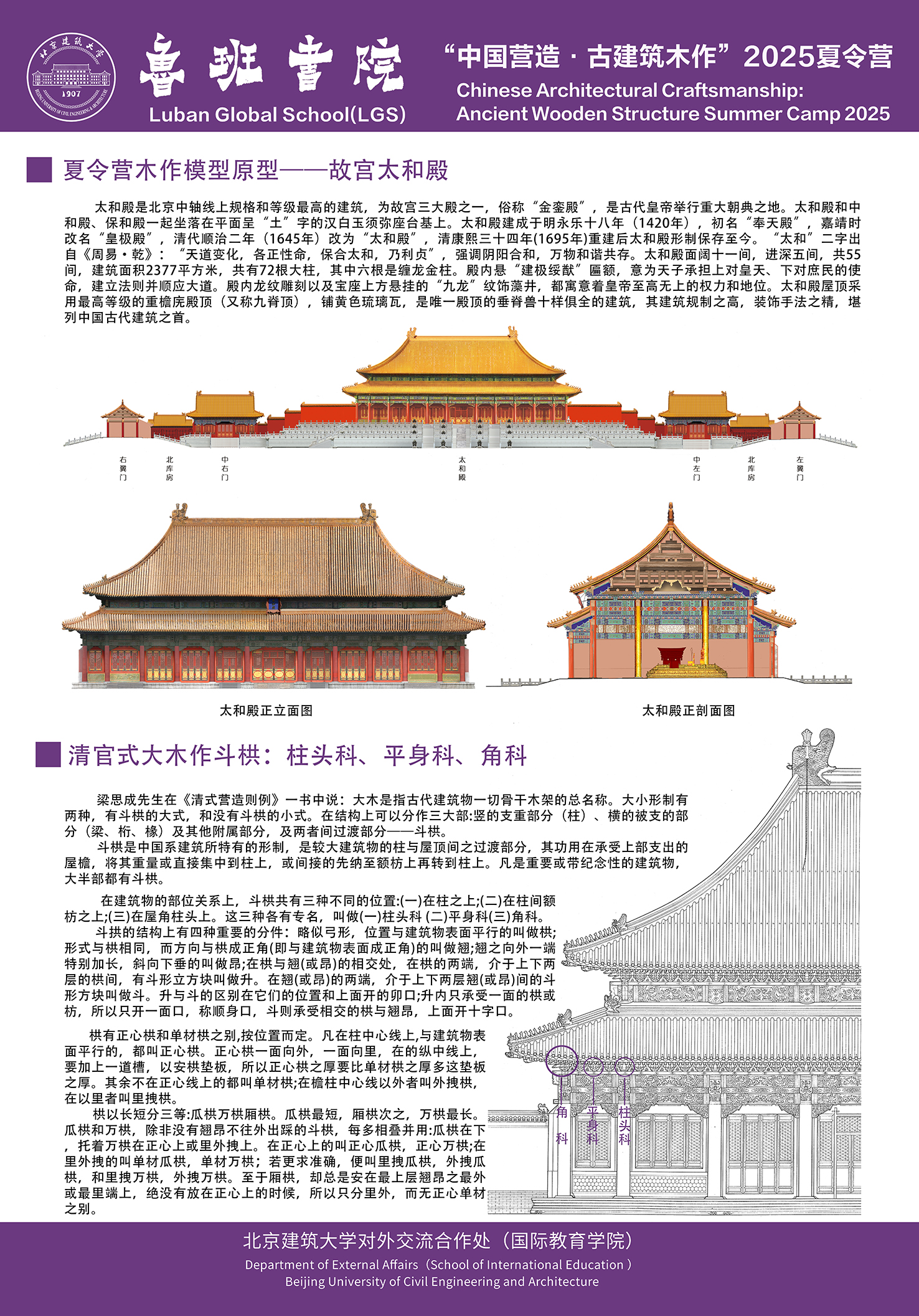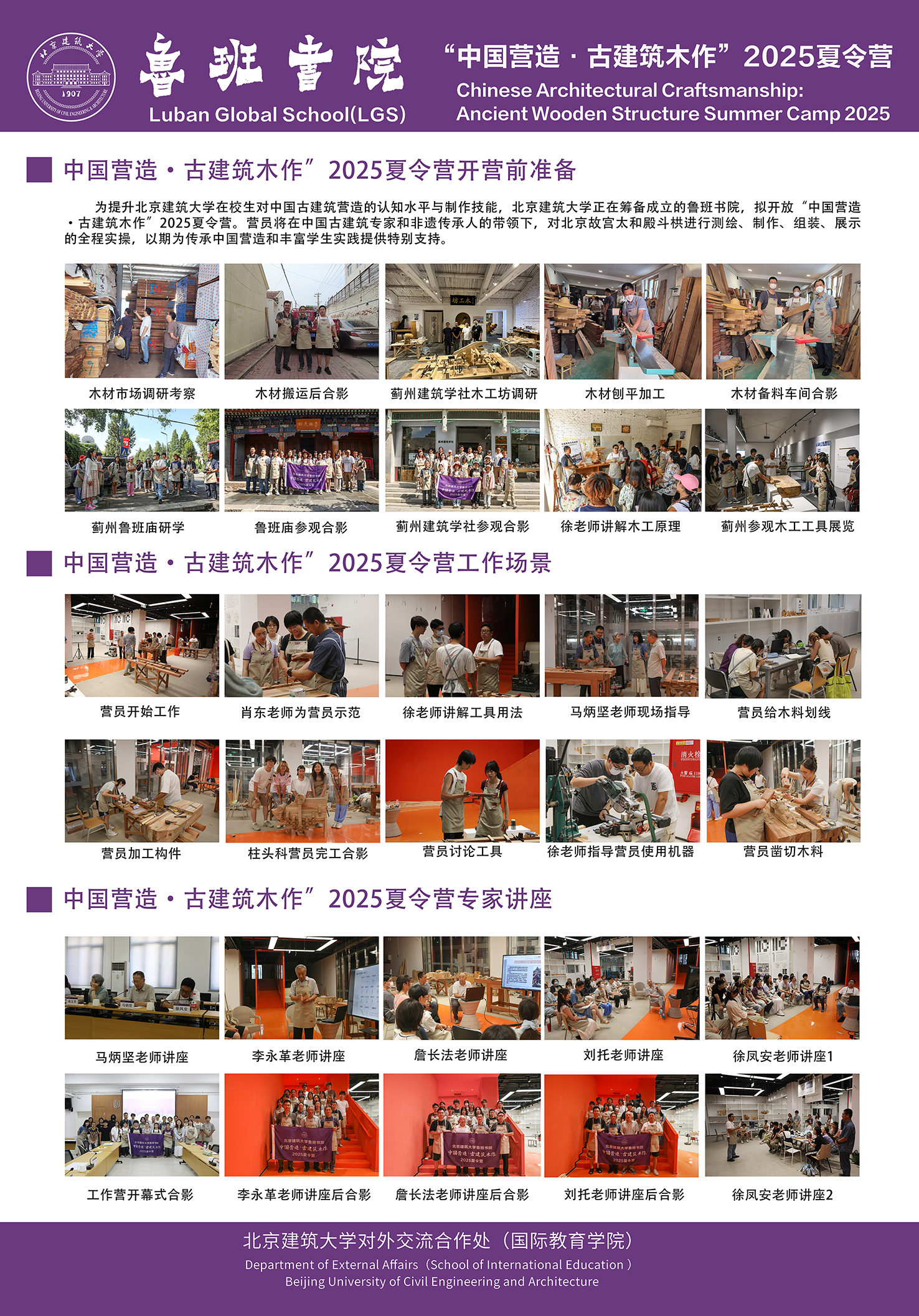 本次夏令营由北京建筑大学鲁班书院主办,采取“学者 匠师”双导师制和“理论 实践”双轨教学模式,通过系统性的文化讲授与动手实践,全面提升营员对古建筑木作技艺的认知与实操能力。活动不仅为青年学子提供了深入传统建筑文化内核的珍贵机会,也为中华优秀传统文化的创造性转化与创新性发展注入了新活力。