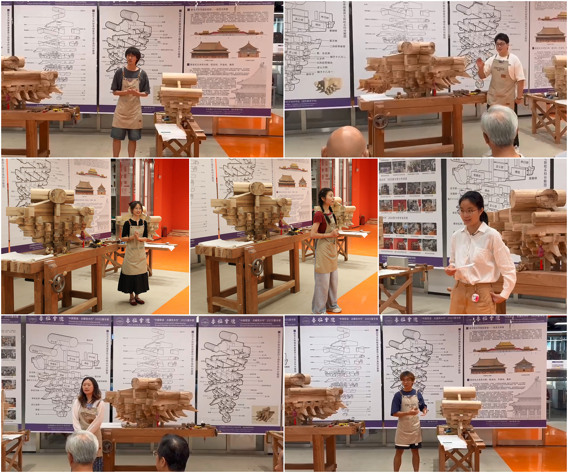在为期十五天的夏令营实践过程中,师生们经历了选购木材、解料加工、赶制木工桌、实地参观调研、、电脑绘图和建模、手工制作和搭建模型等一系列环节,以故宫太和殿的角科、柱头科和平身科三攒斗栱为原型,按照1:2的制式,从理论走向应用、从书本走向实践,亲手完成了一系列结构严谨、形神兼备的清官式斗拱木作作品,充分展现出对中国古建筑文化和技艺的深刻理解与真挚热爱;充满创意巧思的自制木作周边小物和伴手礼更是让夏令营成果展妙趣横生。