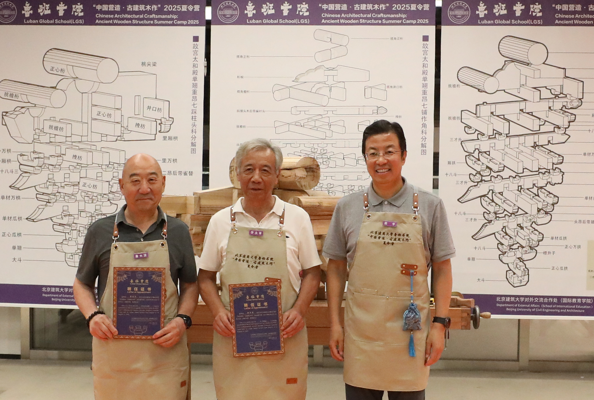 8月25日,北京建筑大学鲁班书院“中国营造·古建筑木作”2025夏令营在西城校区圆满落幕。学校党委书记郑宇,党委副书记、校长张大玉,党委常委、副校长陈朝晖,故宫博物院修缮技艺部原主任、国家级官式古建筑技艺传承人李永革,中国文化遗产研究院原副院长、“仁惠之星”意大利总统骑士勋章获得者詹长法,北京字节跳动科技有限公司不动产业务负责人陈旸俊以及学校相关职能部处、学院负责人、指导教师和全体营员参加了结业仪式。仪式由陈朝晖主持。