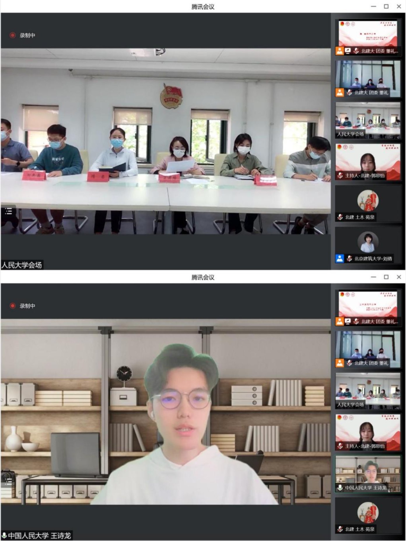 活动中,大家重温了习近平总书记考察中国人民大学的新闻报道,观看了《冬奥有我·一起向未来——首体冬奥志愿者纪录片》和《微光筑梦——北建大冬奥志愿者原创歌曲mv》,共同回忆了两校师生参与冬奥会志愿服务的美好经历。整场活动气氛热烈,两校青年在五四青年节共悟爱国之情,同述爱国之心,共同彰显了新时代青年学子的责任与担当。