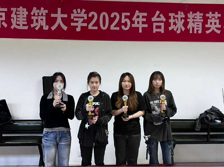 2025年4月15日,为丰富校园文化生活,提升学生体育竞技水平,由我校体育部举办的2025年北京建筑大学台球精英赛在校体育馆顺利举行。本次比赛吸引了各学院学生和教职工约60名台球爱好者参与,经过一天的激烈角逐,男生组教职工冯亚军以及女生组人文学院刘翊天凭借精湛技艺夺得冠军奖杯。