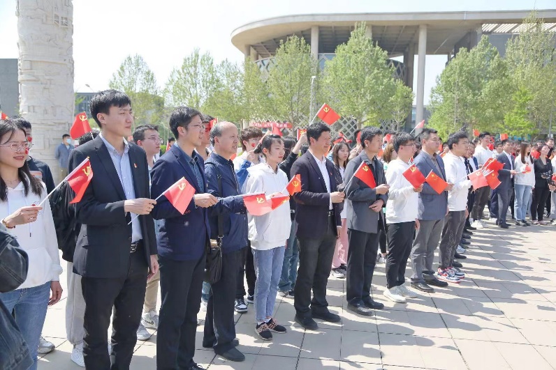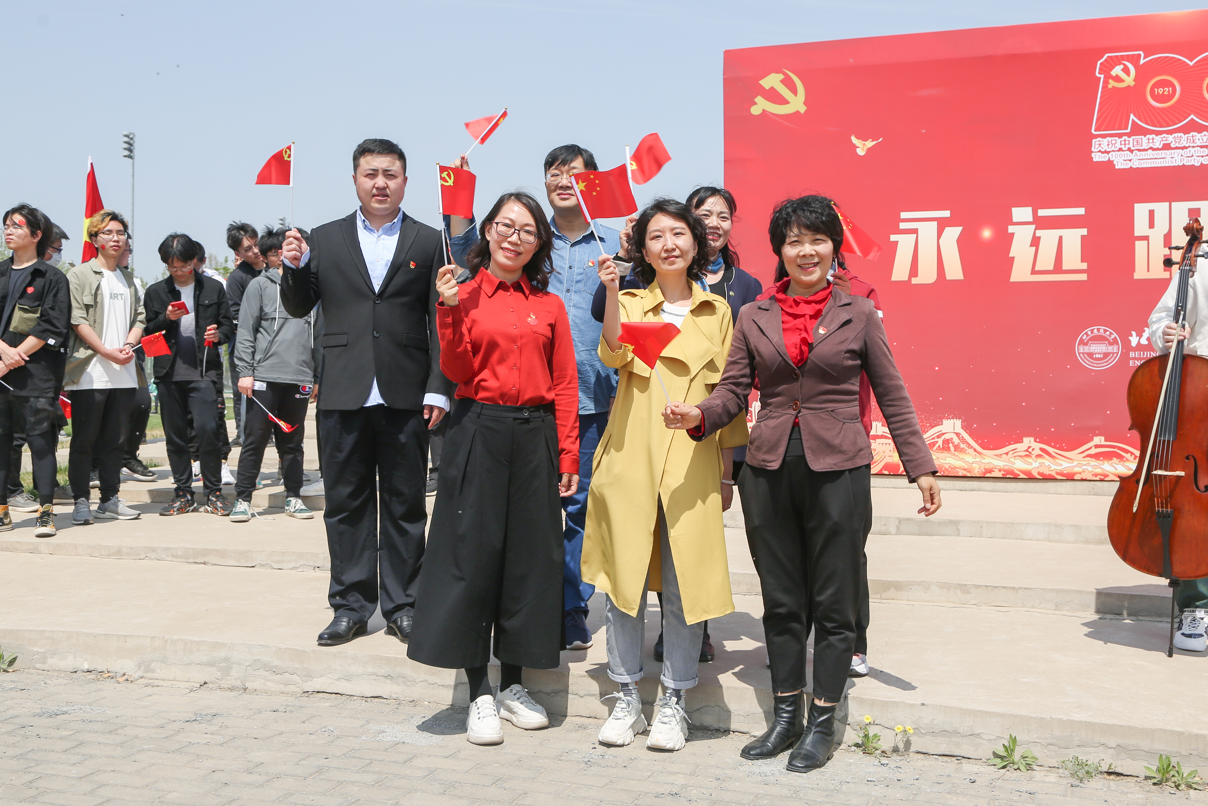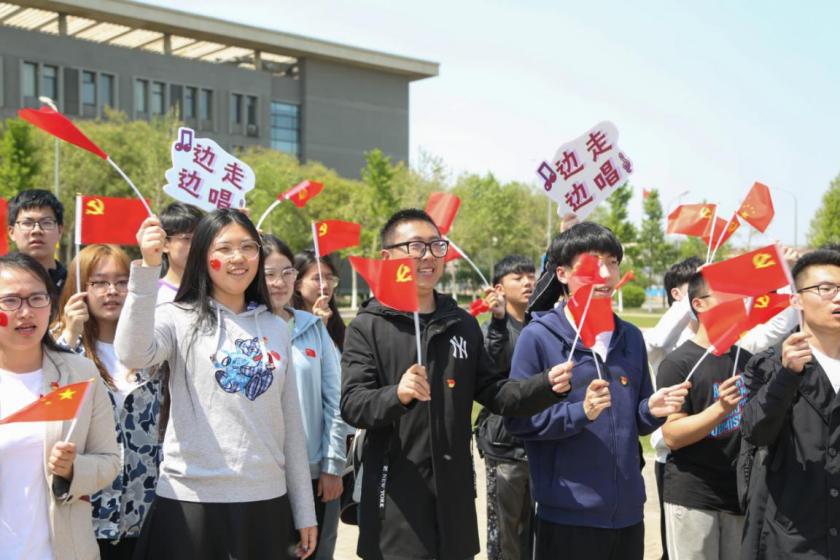 午后时分,300多位师生聚拢于广场载歌载舞,跟随歌曲的节拍,步调一致地挥动手中的旗帜,鲜红的国旗和党旗汇聚成跃动的海洋。