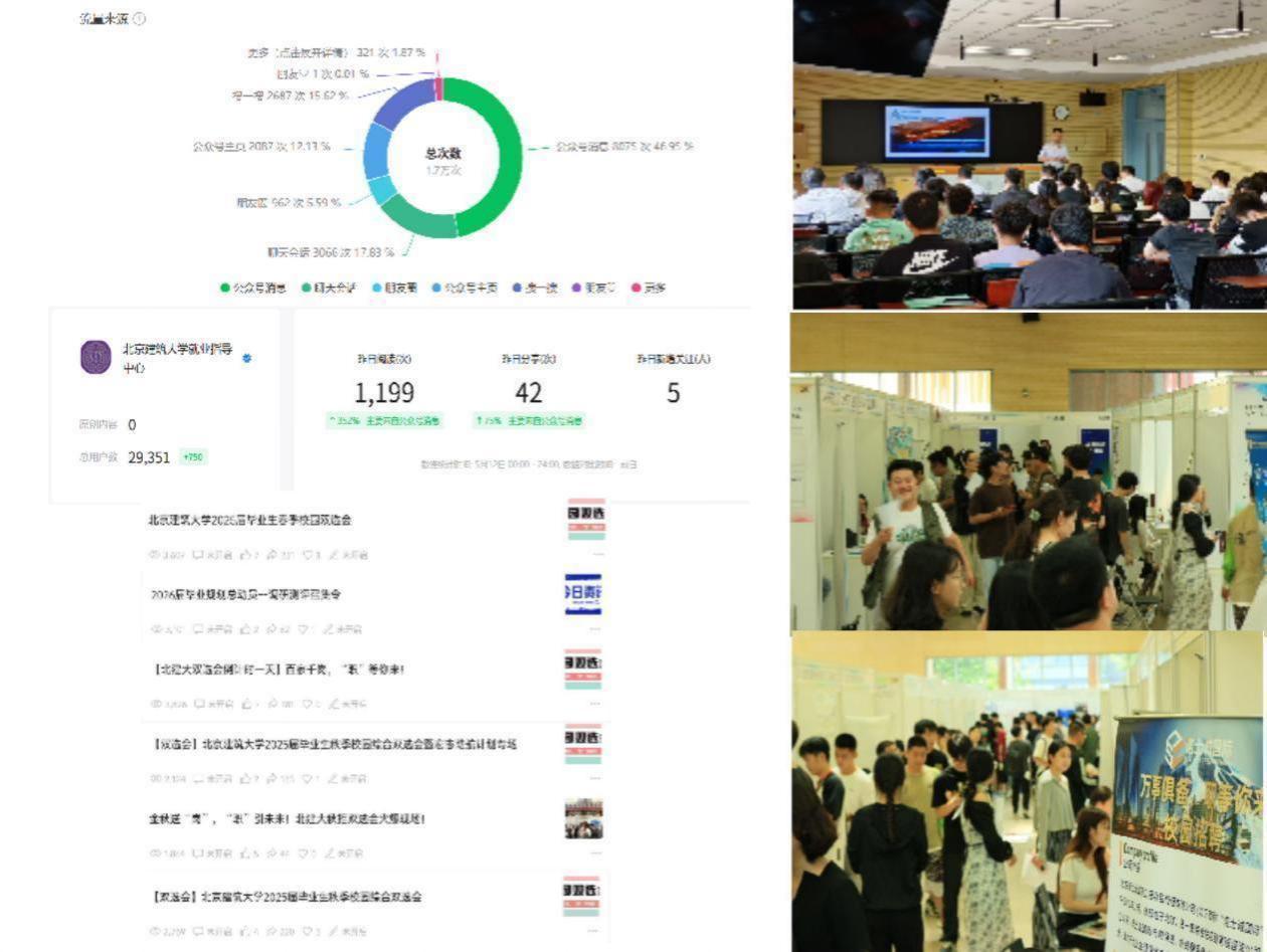 在2024-2025学年,社团协助学校组织4场线下大型综合双选会,联动各专业吸引752家企业,为毕业生搭建高效求职平台;通过职业认知深化、技能培训等活动拓宽学生职业视野。同时,协助运营“北京建筑大学就业指导中心”公众号,关注量达2.9万余人,本学期新增3000 ,累计推送865条 ,开设【政策工具箱】【简历加油站】等特色板块,以多维度内容精准覆盖学生职业发展各阶段需求,强化就业信息服务网络。