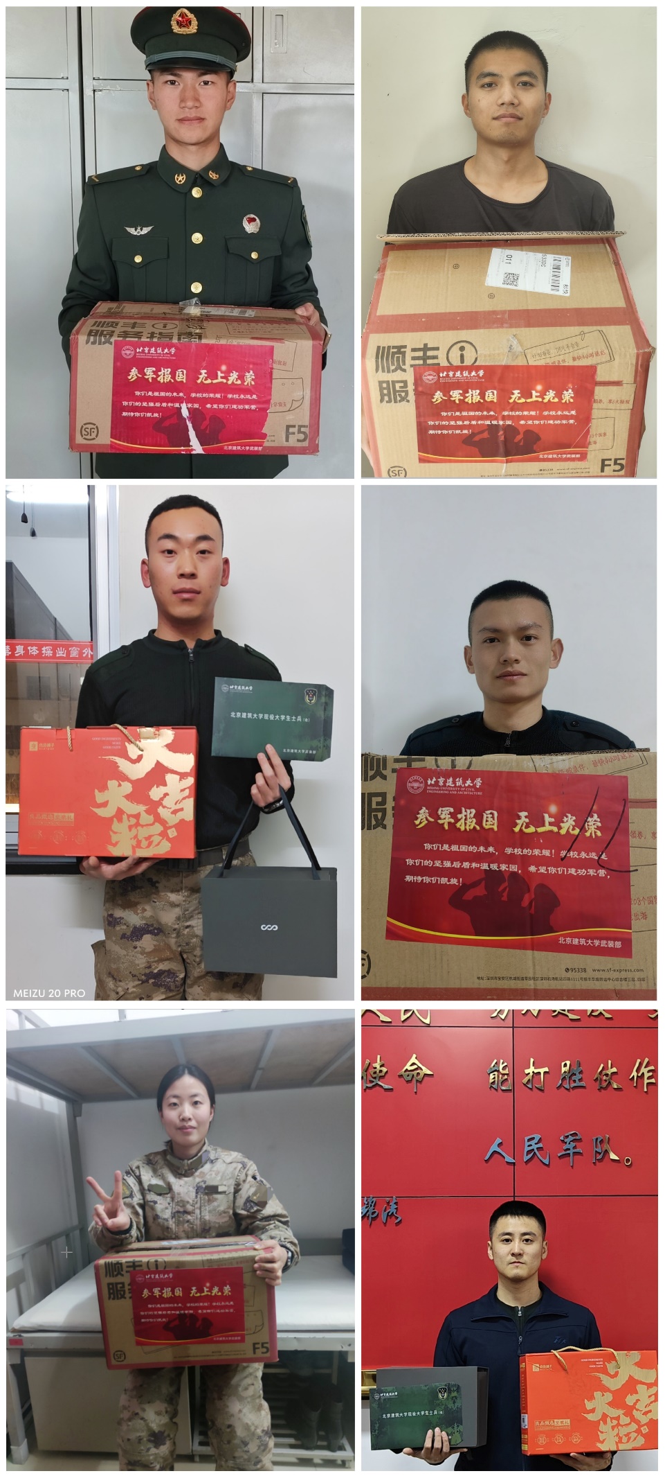 收到学校寄来的慰问品心里暖暖的,我目前身处东北,天气最低能达到零下二十八度,但学校的关心仿佛让我置身春日暖阳中。半年前我放弃读研机会,毅然决然选择投身军营,如今已经完成从一名地方青年向军人的转变。尽管已经毕业快一年了,但学校没有忘记我们,作为曾经的一名北建大学子,更作为一名共产党员、一名现役的解放军战士,我一定会在属于我的战位、站位、展位上发光发热,为家人,为学校,更为国家做出自己应有的贡献。——高嘉康(测绘学院 2023年秋季入伍)