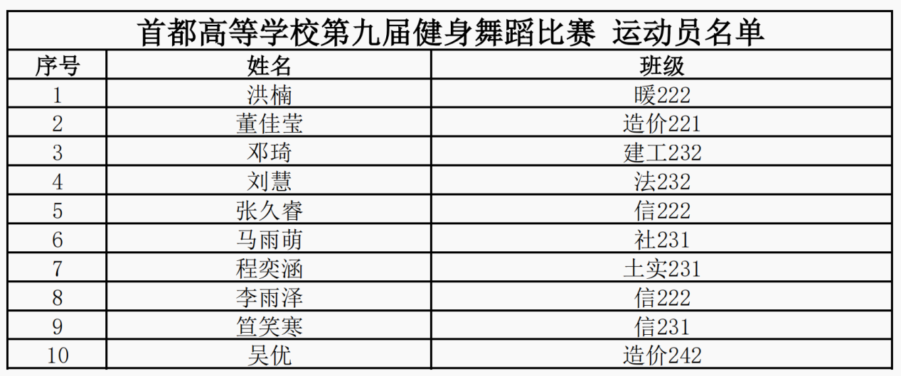 首都高等学校第九届健身舞蹈比赛运动员名单