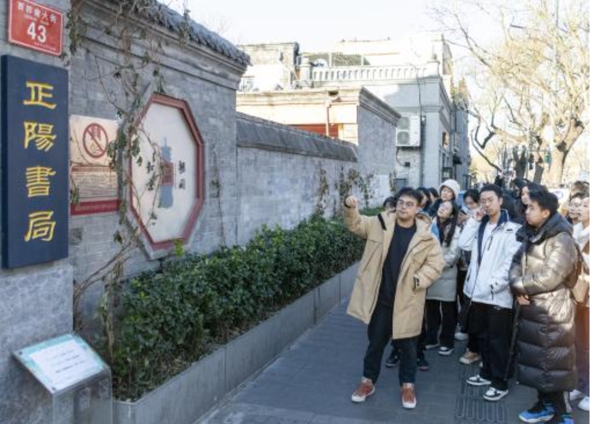 正阳书局,位于西四南大街43号,创办于2009年8月,是北京目前唯一一家只经营北京和老北京相关文献书籍的书店。建筑学院学生徐陈熙结合自己的研究项目为同学们介绍到:“正阳书局在2014年与西城区文化委员会合作,以利用文物保护文物的理念,迁入全国重点文物保护单位砖塔胡同万松老人塔院内,书局打造的“砖读空间”是北京第一家非盈利性质的公共阅读空间。”