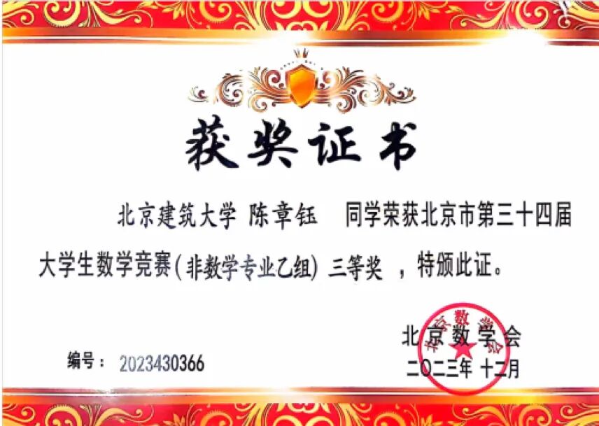 在科研竞赛方面,陈章钰同样展现出了非凡的才华和热情。他对科研有着浓厚的兴趣,深知土木工程领域的发展离不开科技创新。大二时,他便加入了学院的科研竞赛团队,开始了他的科研之旅。在中国国际“互联网 ”大学生创新创业大赛(北京赛区)、北京市大学生数学竞赛等省部级赛事中,他都取得了优异的成绩,为学校赢得了荣誉。这些奖项的获得,不仅是对他科研能力的认可,更是他勇于探索、敢于创新的精神的体现。
