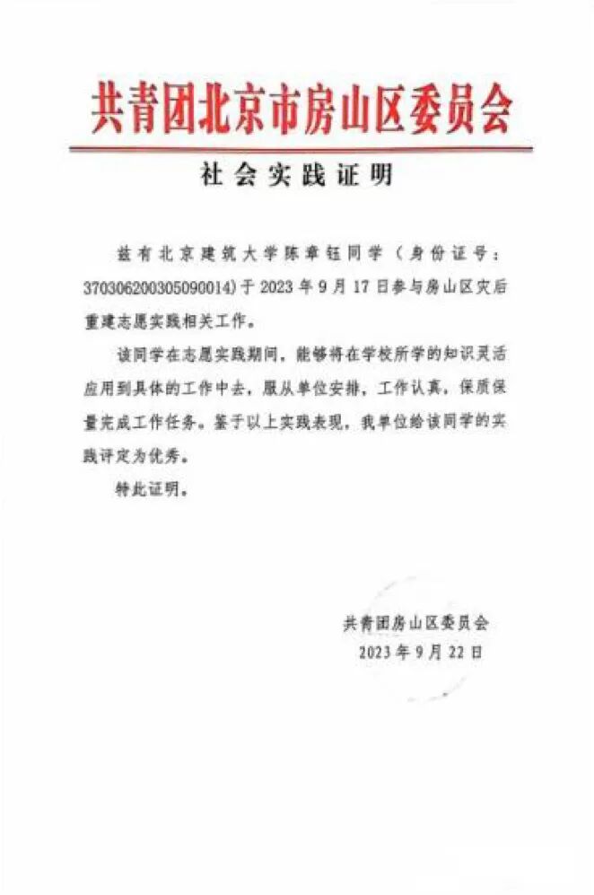 陈章钰在房山区发生洪涝灾害后,积极组织同学们参加房山区灾后修复重建活动,用实际行动诠释了党员的责任与担当。