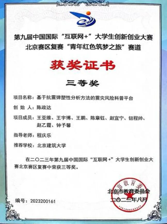 现已保研至重庆大学攻读研究生学位。曾获得中国国际“互联网+”大学生创新创业大赛(北京赛区)三等奖、北京市大学生数学竞赛三等奖两项省部级奖项。曾获综合一等奖学金两次、综合二等奖学金一次。曾连续三年获评优秀学生称号、连续两年获评五四达标创优活动优秀团员称号。曾任北京建筑大学朋辈辅导员一职。