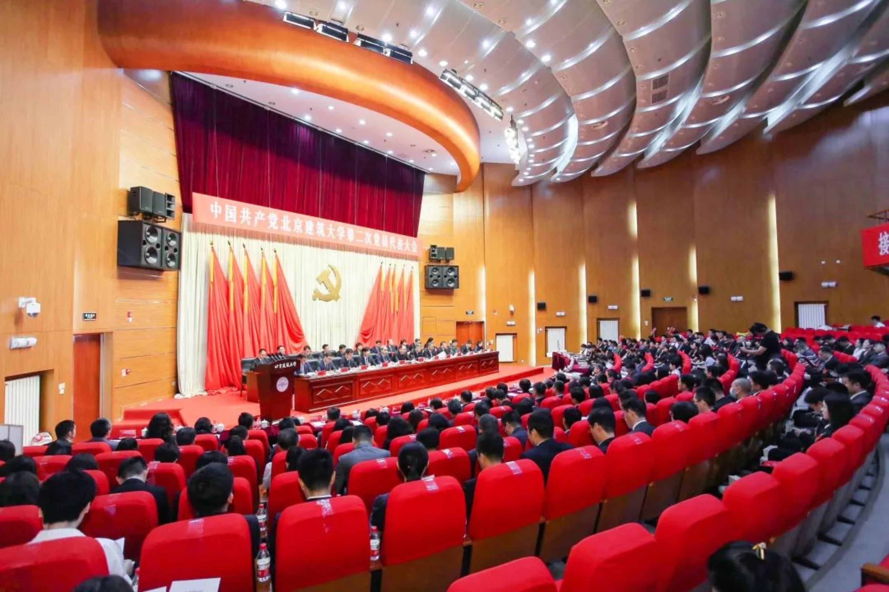 初夏的建大校园,满眼绿意,生机盎然。大会会场内气氛庄重热烈,主席台上方悬挂着“中国共产党北京建筑大学第二次党员代表大会”横幅,主席台正中是由镰刀和锤头组成的中国共产党党徽,十面显眼的红旗分列两侧。大会会场后方,写有“接续奋斗 勇毅前行 全面开启建设高水平特色型大学新征程”的大红横幅格外醒目。