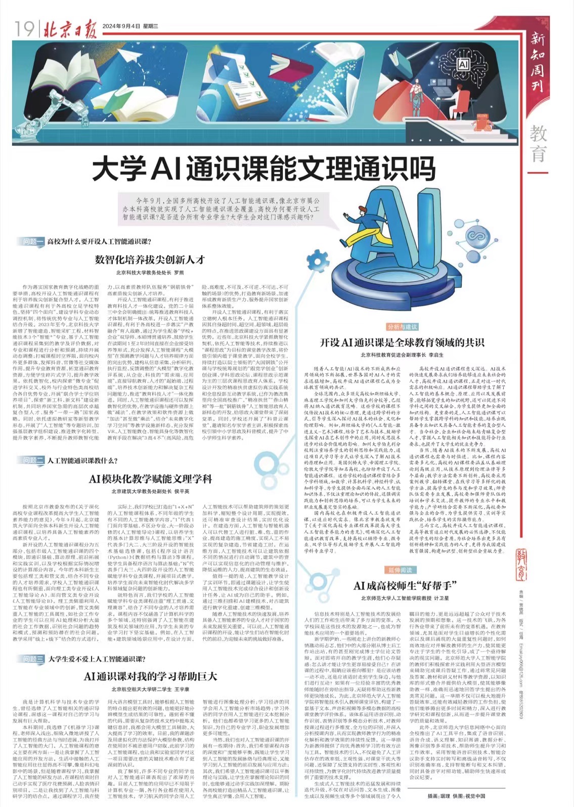 按照北京市教委发布的《关于深化高校专业课程改革提高大学生人工智能素养能力的意见》,今年9月起,北京建筑大学面向全体本科新生开设人工智能通识课程,以培养具备人工智能素养的高素质专业人才。