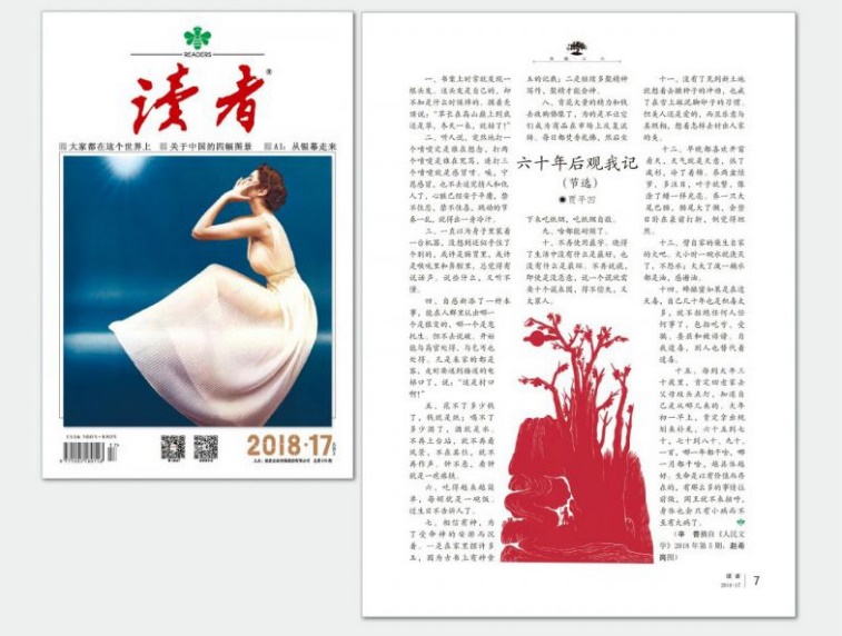 “读者如花朵、田野、理想殿堂,给艺术家创作提供了广阔的空间;在为《读者》创作插画的过程中,我的创作思路得到了拓展,视野也更为开阔。”赵希岗教授说,“在十余年的创作过程中,逐渐形成了风俗人情类、人文哲理类、自然情怀类等不同内容的艺术形式。”其新剪纸艺术作品逐渐成为《读者》插画中一种特有的、艺术个性鲜明的文化标识,受到读者们喜爱,为此《读者》专门与赵希岗商议,多次为他的新剪纸艺术作品开发了一系列《读者》文创作品。
